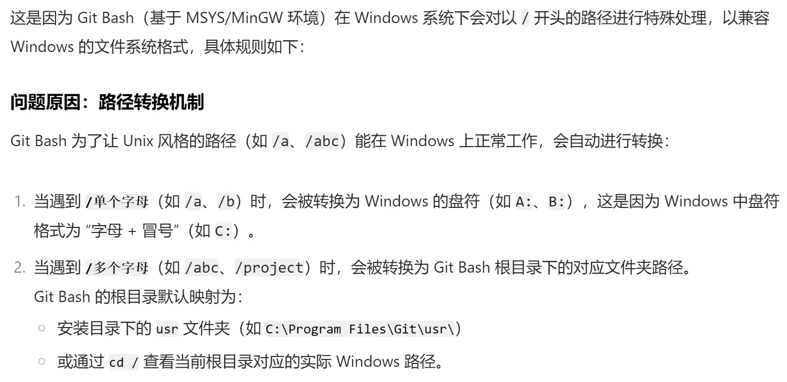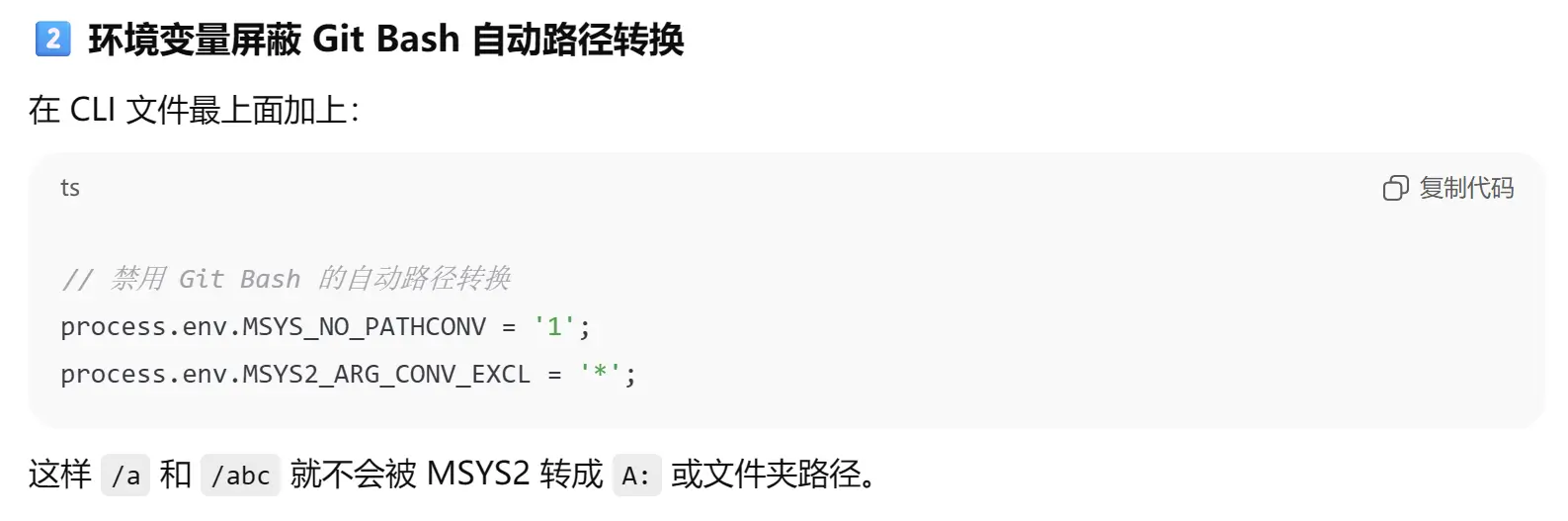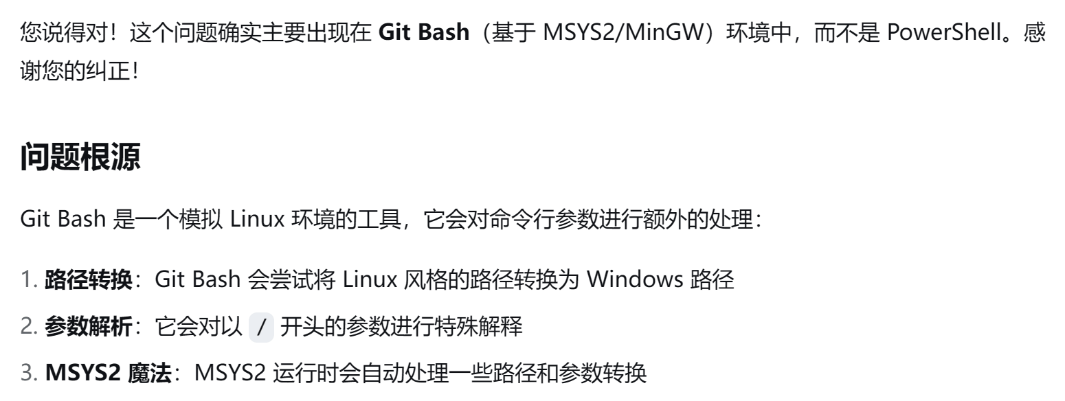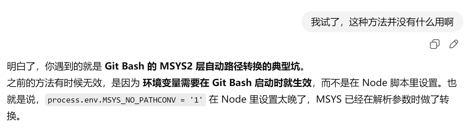 在我继续追问下,它也给出了设置MSYS_NO_PATHCONV=1的方案,不过也是一样命令都跑不通。
