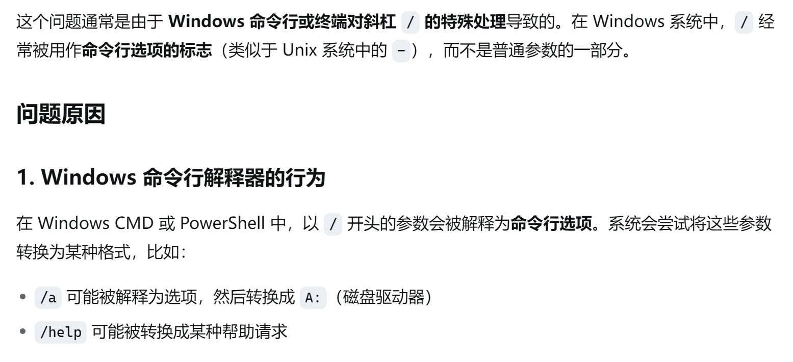 ❓ 我需要在命令行中传递一个以“/”开头的参数,比如:“/a/b/c”、“/api/foo/bar”。