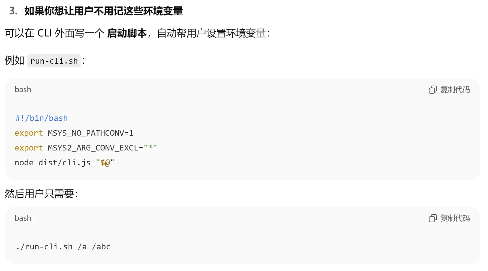 MSYS_NO_PATHCONV=1和MSYS2_ARG_CONV_EXCL="*" - 提示用户使用